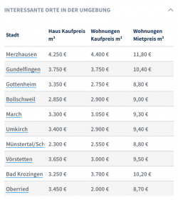 Das Wohnen im Speckgürtel bietet ebenfalls viele Vorteile, denn hier sind die Eigenschaften des Land- und Stadtlebens miteinander vereint. Man erreicht in Kürze die Innenstadt und genießt gleichzeitig den ländlichen Charme. Gerade Ortschaften wie Merzhausen, St.Georgen, Kappel oder auch Gundelfingen sind beliebt und mit einem durchschnittlichen Quadratmeterpreis für Häuser zwischen 4.000 und 4.500 Euro besonders interessant.